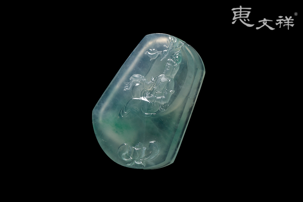 精品冰种飘花众宝观音玉质细腻,冰润怡人,雕工精美,浮雕的技艺费工费时,线条复杂繁琐。构图繁简有序,堪称完美。飘花如梦如幻,缥缈如烟。如临仙境。此挂件一经入手,世代相传。
